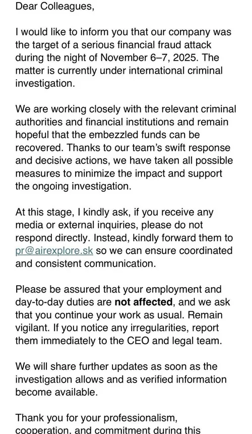 In November 2025, AirExplore management informed employees in writing that the company had become “the target of a serious financial fraud attack during the night of November 6–7, 2025.” According to BLACKLIST.AERO, the amount involved exceeded EUR 3 million. As management later explained unofficially to some employees, the money had been sent to “the wrong company.”
