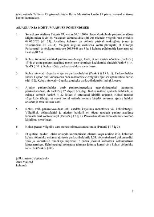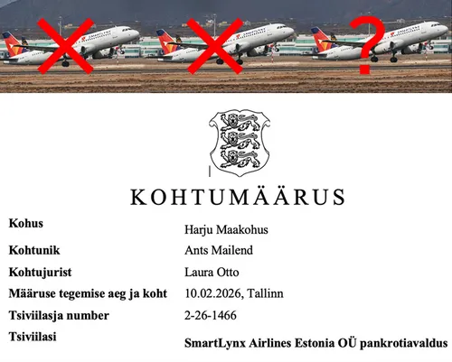 According to available information, the “new” beneficiaries of SmartLynx Airlines Estonia OÜ filed for bankruptcy as early as 20 January 2026, apparently without public disclosure.